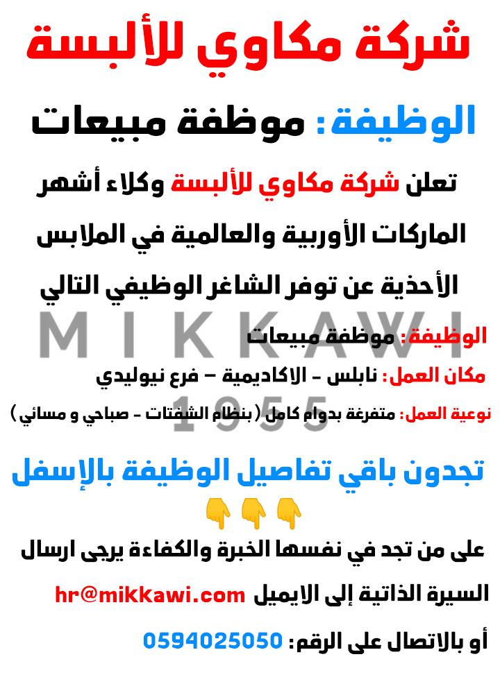 📢 تعلن شركة مكاوي للألبسة وكلاء أشهر الماركات الأوربية والعالمية في الملابس والأحذية عن توفر الشاغر الوظيفي التالي:• الوظيفة: موظفة مبيعات• مكان العمل: نابلس - الاكاديمية – فرع نيوليدي• نوعية العمل: متفرغة بدوام كامل (بنظام الشفتات -صباحي و مسائي)- نحن نبحث عن الافراد الذين لديهم شغف في المبيعات ويزدهرون في بيئة نمو سريعة الخطى وذلك بالتفاعل مع العملاء وتقديم خدمة بيع استثنائية ومميزة📌 المهام والمسؤوليات:• التحية والتفاعل مع جميع العملاء وتقديم المساعدة كما هو مطلوب .• تقديم خدمة عملاء استثنائية عند العمل في معرض الشركة.• الحفاظ على المعايير المرئية للمعرض وتمثيل صورة العلامة التجارية.• حسن المظهر واللباقة في التعامل مع الزبائن.📌 المتطلبات:• العمل (بنظام الشفتات - صباحي ومسائي)• أن تكون من سكان نابلس.• المرونة في أوقات الدوام وتحمل ضغط العمل (أيام الاعياد - التنزيلات).• خبرة في خدمة العملاء ومبيعات الملابس النسائية لا تقل عن سنتين.• القدرة على الاقناع.• المقدرة على التعلم و الاهتمام بتفاصيل الموديلات.• القدرة على تعدد المهام في بيئة العمل.📌 بيانات الوظيفة:• المنطقة : نابلس• العنوان : شركة مكاوي للألبسة - شارع الاكاديمية• الدوام : كامل• الدرجة العلمية: بكالوريوس• المستوى المطلوب: متوسط• الخبرة: لا تقل عن سنتين📍 على من تجد في نفسها الخبرة والكفاءة، يرجى ارسال السيرة الذاتية إلى الايميل: hr@mikkawi.com ، أو بالاتصال على الرقم: 0594025050وظائف فلسطين... بِكُم نَّكبَر
