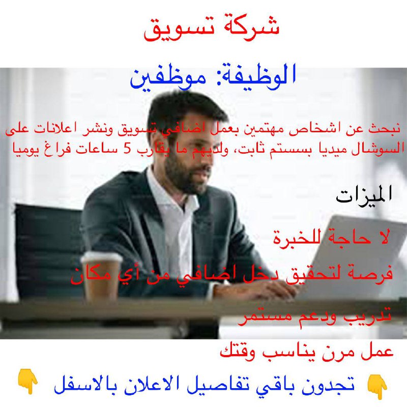 📢 تعلن شركة تسويق عن حاجتها لتعيين موظفين تسويق الكتروني📌 نبحث عن اشخاص مهتمين بعمل اضافي تسويق ونشر اعلانات على السوشال ميديا بسستم ثابت، ولديهم ما يقارب 5 ساعات فراغ يوميا.📌 الميزات:• لا حاجة للخبرة • فرصة لتحقيق دخل إضافي من أي مكان • تدريب ودعم مستمر • عمل مرن يناسب وقتك 📍 يمكنكم التقدم للوظيفة من خلال التواصل عبر الواتساب على الرقم: 962798054607+ 📱أو بإمكانكم التقدم للوظيفة من خلال الرابط: https://forms.gle/Bub4HiAEzxsom7or8وظائف فلسطين... بِكُم نَّكبَر