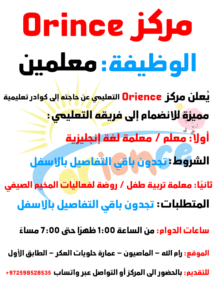 📢 يُعلن مركز Orience التعليمي عن حاجته إلى كوادر تعليمية مميزة للانضمام إلى فريقه التعليمي:🧑🏫 أولاً: معلم / معلمة لغة إنجليزيةالشروط:- حاصل/ة على مؤهل جامعي في الأدب الإنجليزي.- يمتلك/تملك خبرة سابقة في تدريس اللغة الإنجليزية لمختلف المراحل.- من سكان الماصيون او المناطق القريبة.👧 ثانيًا: معلمة تربية طفل / روضة لفعاليات المخيم الصيفيالمتطلبات:- حاصلة على شهادة في تربية الطفل أو تخصص ذي صلة.- محبة للأطفال وقادرة على التعامل معهم بطريقة تربوية وإبداعية.- خبرة سابقة في الأنشطة والفعاليات الترفيهية والتعليمية.🕐 ساعات الدوام: من الساعة 1:00 ظهرًا حتى 7:00 مساءً📍 الموقع: رام الله – الماصيون – عمارة حلويات العكر – الطابق الأول📩 للتقديم: بالحضور الى المركز أو التواصل عبر واتساب: +972598528535