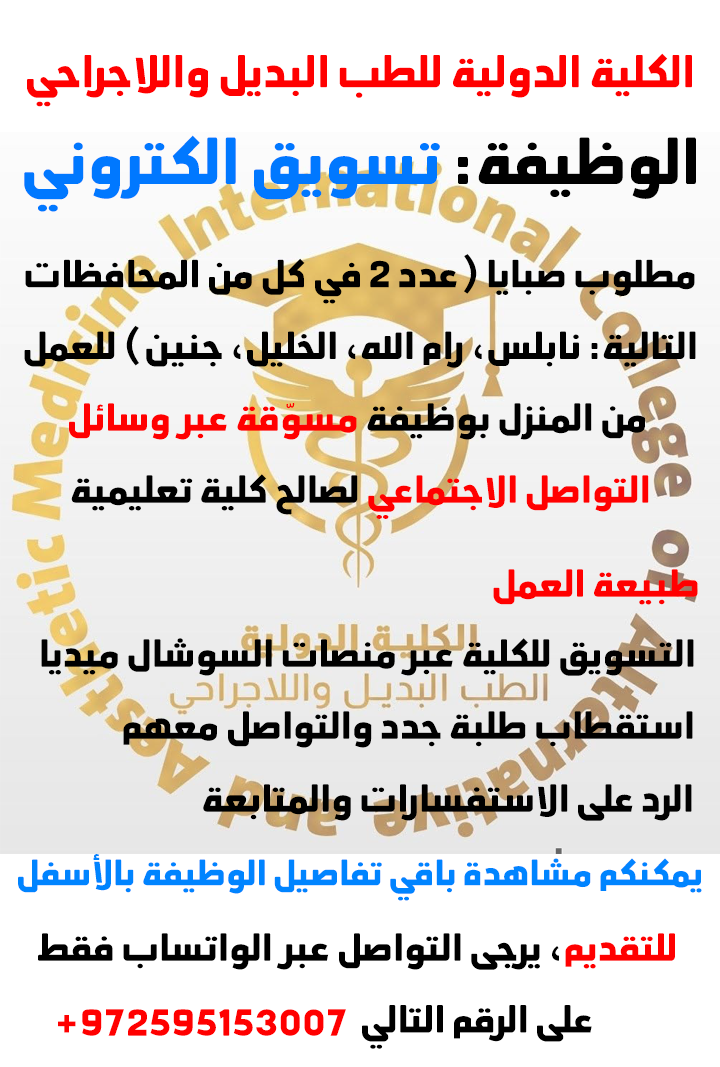 إعلان وظيفة – مسوّقة لكلية تعليميةمطلوب صبايا (عدد 2 في كل من المحافظات التالية: نابلس، رام الله، الخليل، جنين) للعمل من المنزل بوظيفة مسوّقة عبر وسائل التواصل الاجتماعي لصالح كلية تعليمية.🔹 طبيعة العمل:• التسويق للكلية عبر منصات السوشال ميديا• استقطاب طلبة جدد والتواصل معهم• الرد على الاستفسارات والمتابعة🔹 الشروط:• خبرة في استخدام وسائل التواصل الاجتماعي (فيسبوك، إنستغرام، تيك توك وغيرها)• القدرة على استقطاب الطلبة والإقناع• مهارة تواصل عالية• الجدية والالتزام🔹 مميزات العمل:• العمل من المنزل• دوام مرن وعلى راحتك• دخل جيد حسب الأداء📩 للتقديم، يرجى التواصل عبر الواتساب فقط على الرقم التالي: 972595153007+وظائف فلسطين... بِكُم نّّكبَر