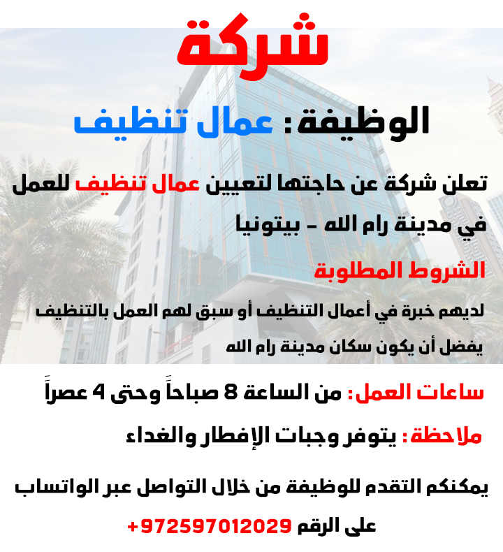 📢 تعلن شركة عن حاجتها لتعيين عمال تنظيف للعمل في مدينة رام الله - بيتونيا📌 الشروط المطلوبة:• لديهم خبرة في أعمال التنظيف أو سبق لهم العمل بالتنظيف• يفضل أن يكون سكان مدينة رام الله وبالأخص بيتونياساعات العمل: من الساعة ٨ صباحاََ وحتى ٤ عصراََملاحظة: يتوفر وجبات الإفطار والغداء📍 يمكنكم التقدم للوظيفة من خلال التواصل عبر الواتساب على الرقم: 972597012029+ 📞وظائف فلسطين... بِكُم نَّكبَر